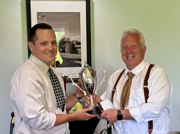 Tournament champion, Andrew Robertson, left, accepts the trophy from event host Chris Hawes.