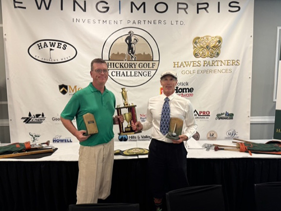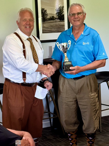 The tournament’s net champion Ron Wiens, right, is presented the trophy from event host Chris Hawes.